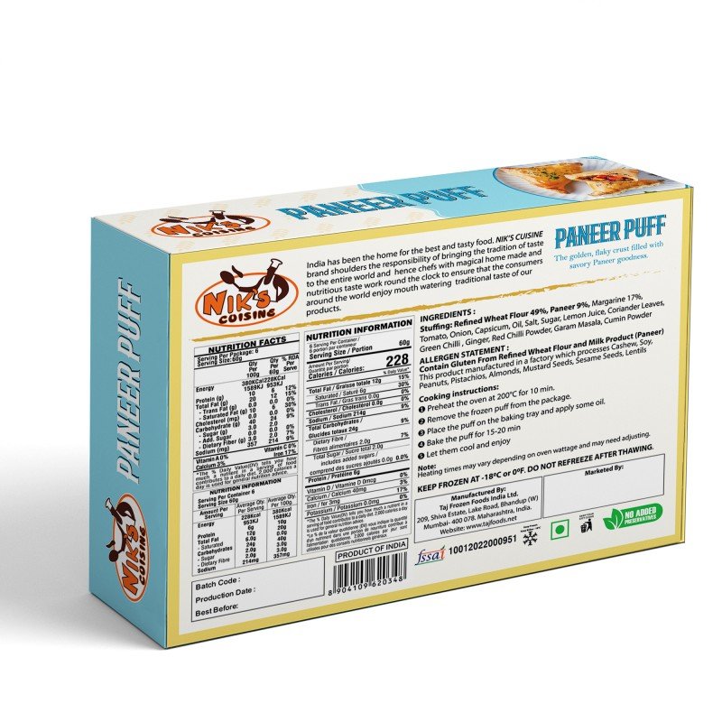Details: INGREDIENTS : Stuffing: Refined Wheat Flour 49%, Paneer 14%, Margarine 17%, Tomato, Onion, Capsicum, Oil, Salt, Sugar, Lemon Juice, Coriander Leaves, Green Chilli , Ginger, Red Chilli Powder, Garam Masala, Cumin Powder