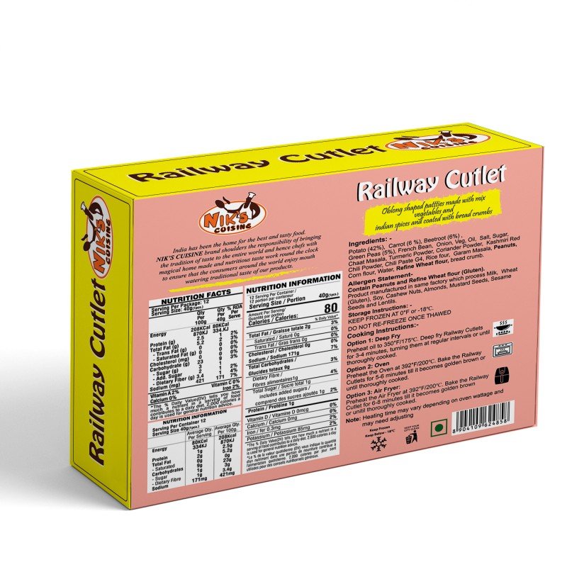 Details: Ingredients: – Potato (42%), Carrot (6 %), Beetroot (6%) , Green Peas (5%), French Bean, Onion, Veg, Oil, Salt, Sugar, Chaat Masala, Turmeric Powder, Coriander Powder, Kashmiri Red Chili Powder, Chili Paste G4, Rice four, Garam Masala, Peanuts, Corn flour, Water, Maida,bread crumb.