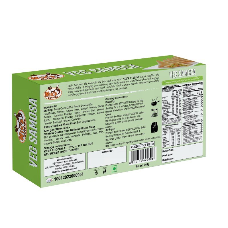 Details: Ingredients:- Stuffing: Fresh Onion(22%), Potato Dices(20%), Cauliflower, Carrots, Green Peas, Ginger Powder, Garlic Powder, Turmeric Powder, Cumin Powder, Salt, Lemon Juice, Cinnamon Powder, Cardamom Powder, Cloves Powder, Bay Leaf Powder, Coriander. Pastry: Refined Wheat Flour, Salt, Vegetable Oil.