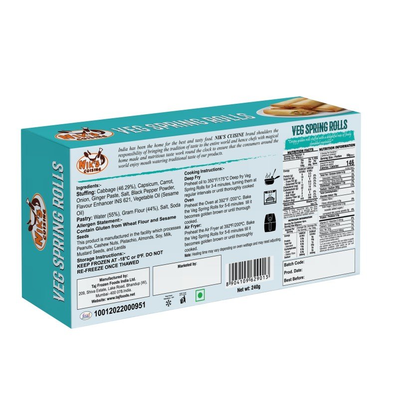 Details: Ingredients:- Stuffing: Cabbage (46.29%), Capsicum, Carrot, Onion, Ginger Paste, Salt, Black Pepper Powder, Flavour Enhancer INS 621, Vegetable Oil (Sesame Oil) Pastry: Water (55%), Gram Flour (44%), Salt, Soda